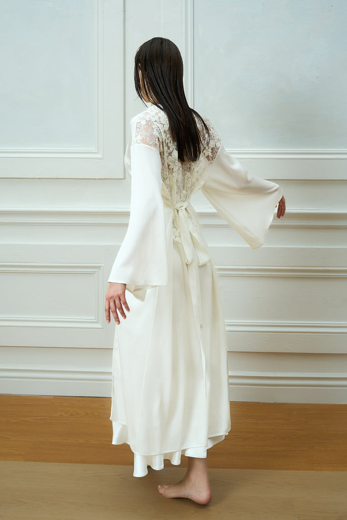Back Lace Paneled Belted Semi-sheer Peignoir in White