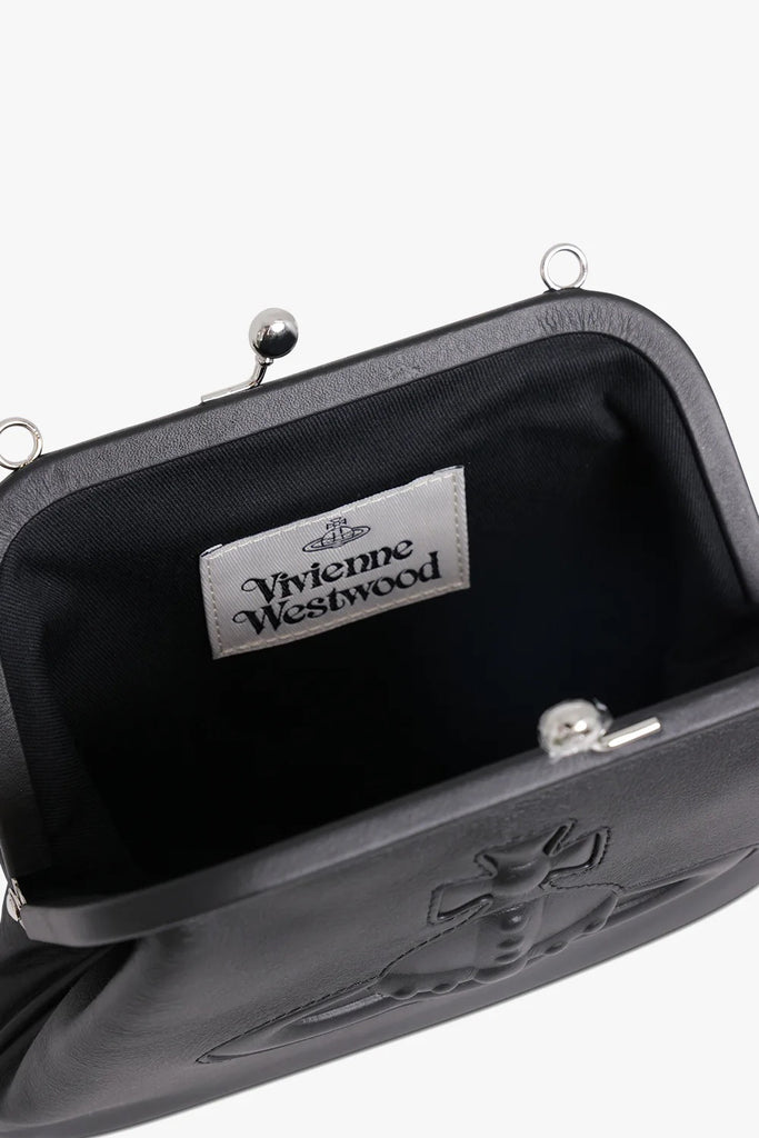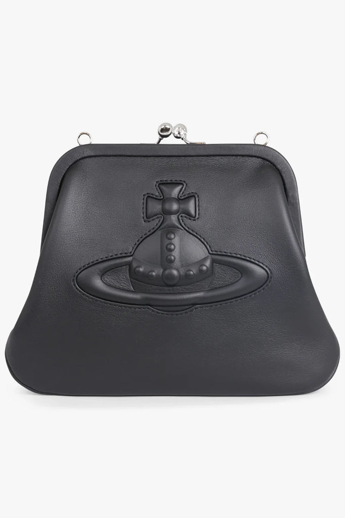 The Vivienne's clutch features a tonal kiss-lock frame, reminiscent of early 20th-century antique coin purses, complete with silver-tone plating. The piece receives a croc-embossed surface, complete with a metal orb on the front panel - embodying Vivienne's innovative vision of launching tradition into the future.