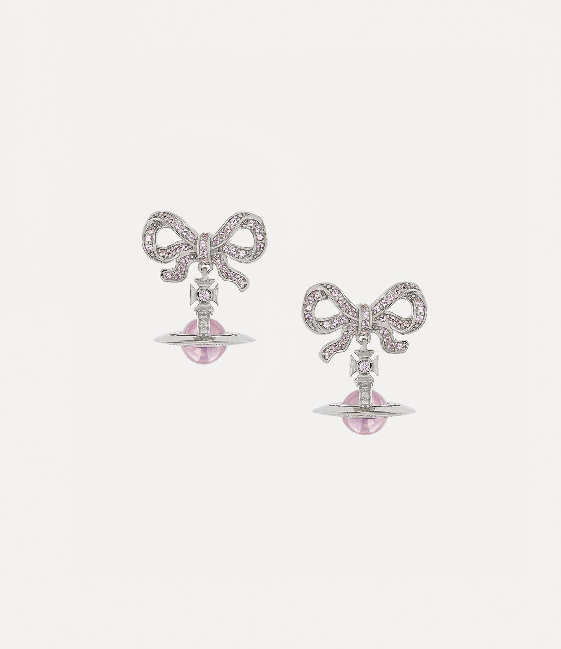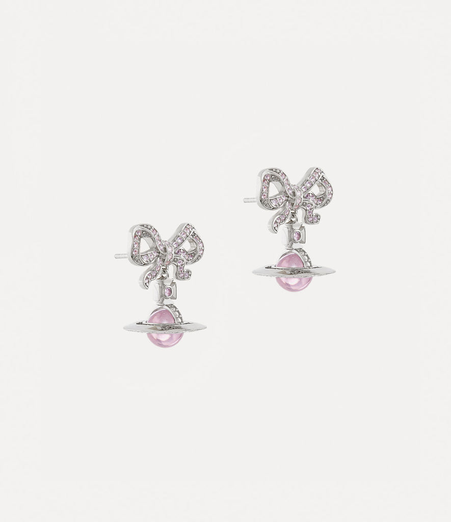 Octavie earrings showcase a bow stud design reminiscent of Georgian jewellery, adorned with pavé-set glistening crystals in light pink hues. This piece incorporates our signature three-dimensional dangle orb motif, featuring a platinum-tone silver finish and a finely crafted coloured gemstone at its centre.
