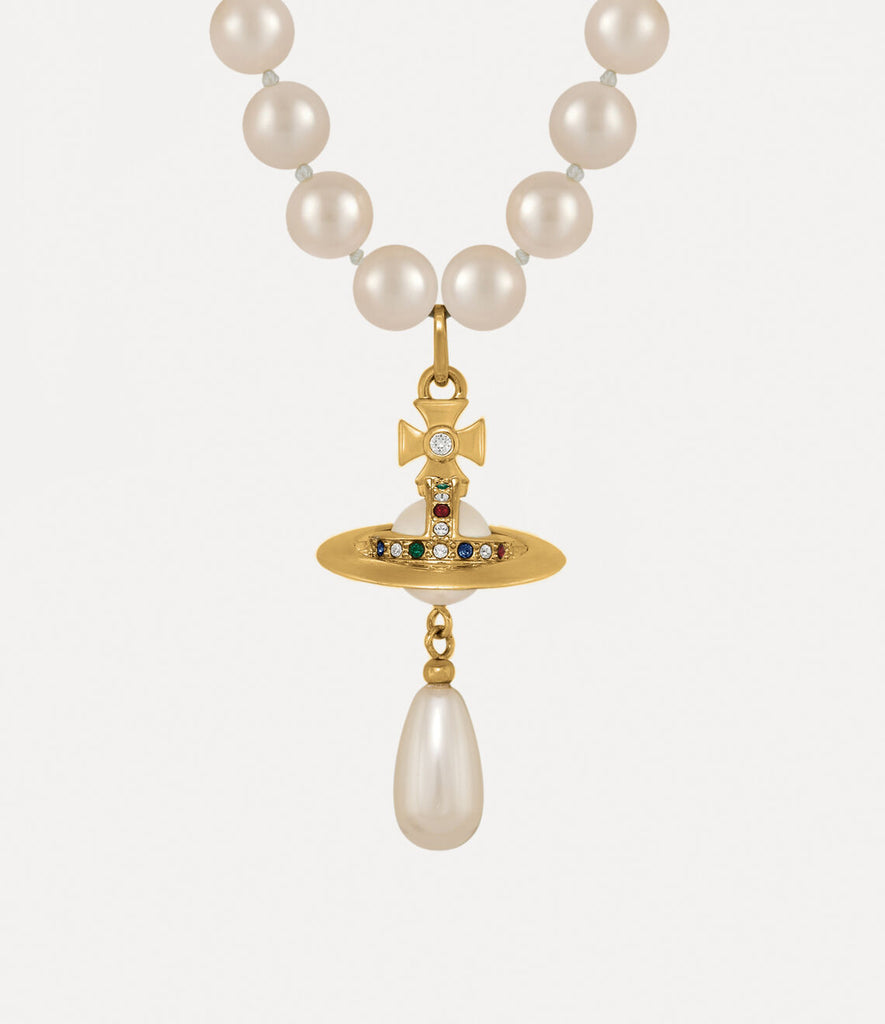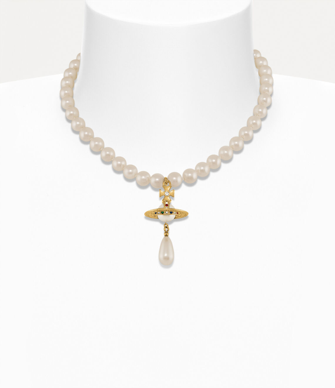 In the late 1980s, Vivienne Westwood unveiled her iconic pearl concept during the Harris Tweed Fall 1987 fashion show, featuring a single-strand choker. One Row Pearl Drop choker echoes the elegant form of her original design, showcasing a three-dimensional orb motif adorned with crystal accents and a suspended teardrop, pearl detail.
